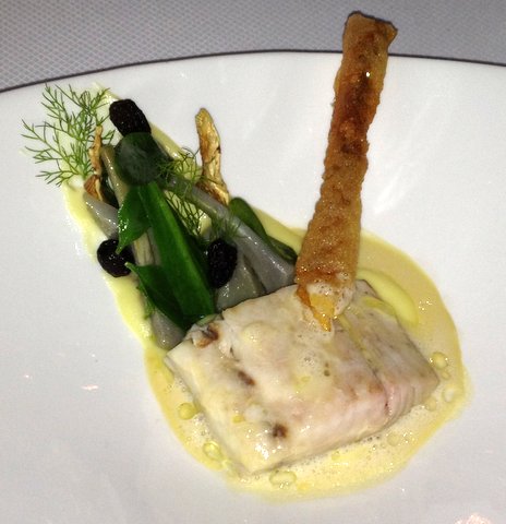 Sea bass & Artichoke: Sea bass prepared in olive oil with cream of artichoke, Taggiasche-olives and ‘Beurre Blanc’ with gin.