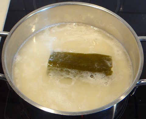 Put the rice in a heavy-bottomed medium-sized pot and add the water. Put the konbu on top. Heat over medium heat and remove and discard the konbu just before the rice starts to boil. The konbu adds a subtle flavor to the rice and can be omitted.