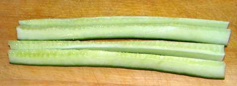 Put two cucumber strips on the wasabi-mayonnaise (one of them upside down).