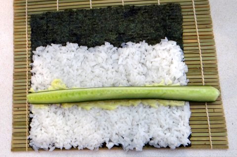 Put a line of the wasabi-mayonnaise on the middle of the rice.
