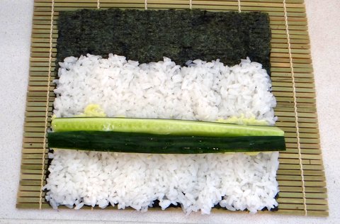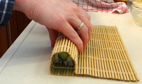 When you have rolled up the nori completely, press lightly on the roll to close it. Roll it another quarter and repeat.