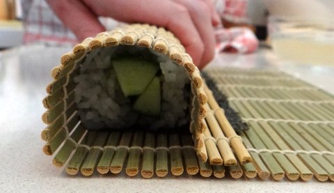 Now extract the end of the bamboo mat so you can keep rolling the sushi without rolling in the bamboo mat.