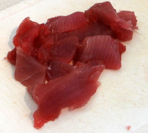 The second type is tuna nigiri. Cut the tuna crosswise in slices about 1/2 cm (1/4 inch) thick. Trim to make nice rectangular slices and keep the trimmings for making tuna maki later. Use the nices part of the tuna steak for the nigiri, making 8 slices.