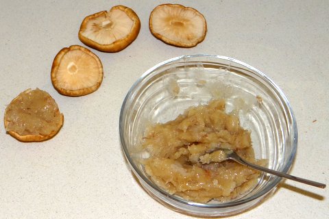Wipe shii-take mushrooms clean and remove the stems (which are tough). Stuff each shii-take cap with shrimp puree.