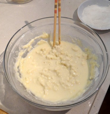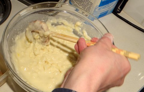 Add the flour and again mix just a bit. The batter is supposed to be lumpy to achieve a light coating rather than oily and heavy. The batter should be as cold as possible for best results.