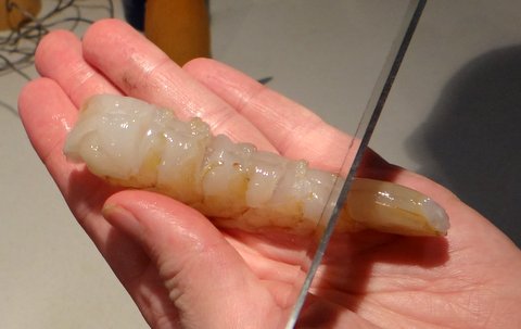To prevent shrimp from curling, make a few incisions along the belly (being careful not to cut your hand), making sure not to cut the shrimp.