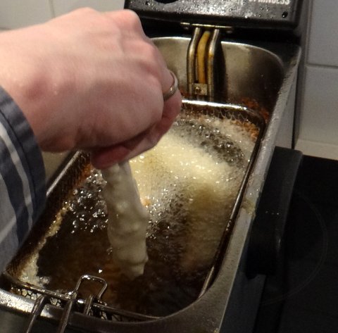 Heat the oil for frying to about 170C/340F. It is best to use a pan on the stove for a more even temperature, but I used an electric fryer anyway since it is easier to handle (and if you have a gas stove it would also be a fire hazard).
