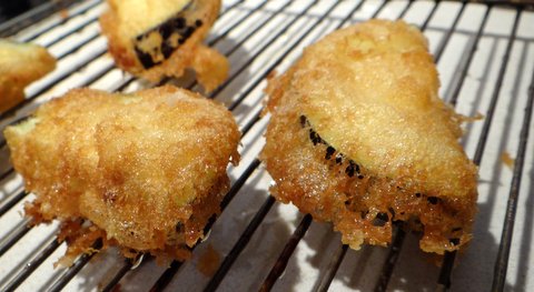 This time we made shrimp tempura, eggplant tempura and shrim-stuffed shii-take tempura, the latter one of my own inventions. You could also use other vegetables like asparagus, bell peppers, sweet potatoes, shiso leaves, lotus roots, shimeji mushrooms, enoki mushrooms, etc.