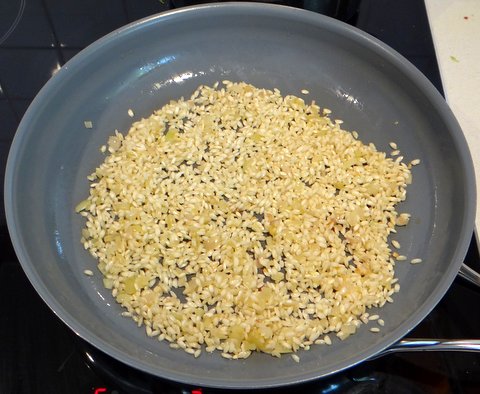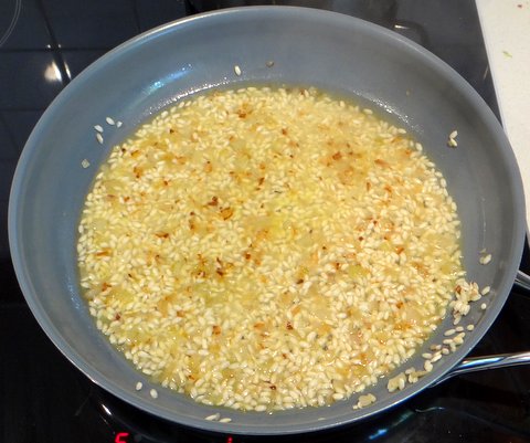 Add the rice and toast for a few minutes until the edges of the rice become translucent.