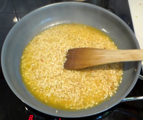 Add a ladle of stock and adjust the heat such that the rice is boiling gently. Stir until most of the stock has been absorbed.