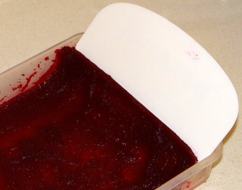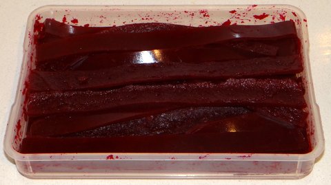 I set just by letting it cool. I used a dough scraper to remove the sheet of beetroot jelly from the plastic container.