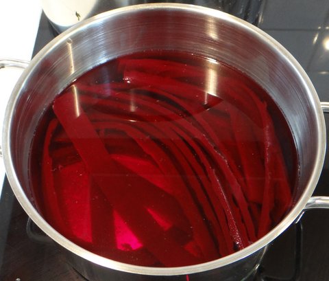 When I say beetroot tagliatelle, I don’t mean tagliatelle flavored or colored with beetroot, but tagliatelle made of mostly beetroot, without any flour. It is a simple form of modernist cuisine (not capitalized, since I’m not referring to the book). I had eaten tomato tagliatelle at Piazza Duomo, one of Italy’s best restaurants in Alba, and thought I could use agar agar to try something similar with beetroot. I don’t have a juicer so I used beetroot puree rather than beetroot juice. Agar agar is a gelling agent that is made from red algae that has the interesting quality that the gelling process is reversible: just reheat to above 85C/185F and it will become liquid again. Turned out that I was reminded of that the hard way, but more about that later.