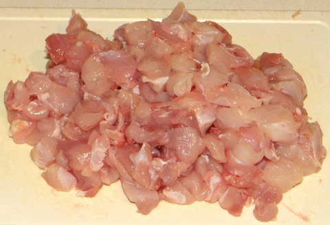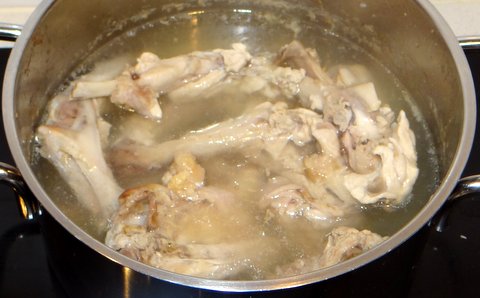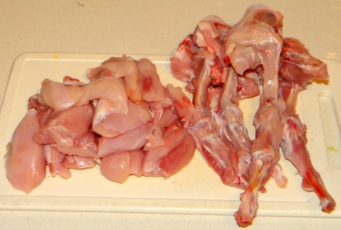 Debone the rabbit legs and reserve the bones. You can probably do a better job than I did, but since I wanted to make stock it was okay to leave some meat on the bones.