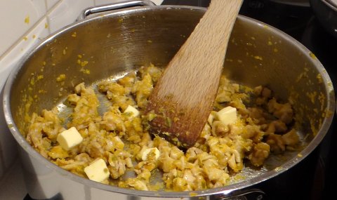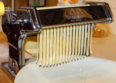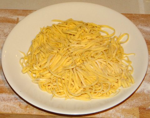 Meanwhile, make the tajarin from the eggs and flour using my instructions for making fresh pasta. The original way is to cut tajarin by hand (by folding the pasta sheets, cutting, and unfolding again), but cutting by machine gives the same result and is easier.
