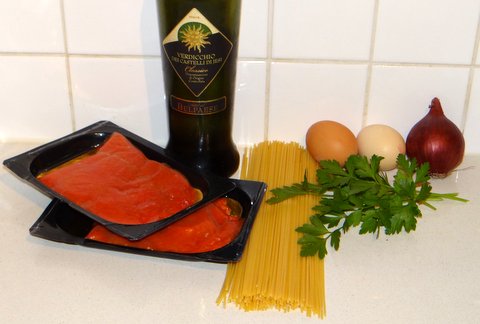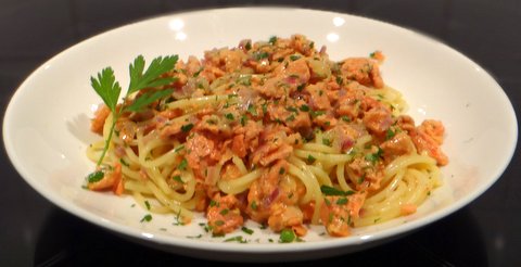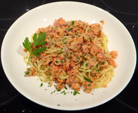This is not an authentic dish, but my own invention. It is a fish version of the well-known spaghetti alla carbonara that uses smoked salmon and red onion instead of pancetta or guanciale. Just like real carbonara, the ‘sauce’ is raw egg that is only cooked slightly by the heat from the pasta. It only takes as long as it takes to cook the spaghetti. This dish is quick, easy, tasty, and healthy thanks to the omega-3 fatty acids in the salmon.
