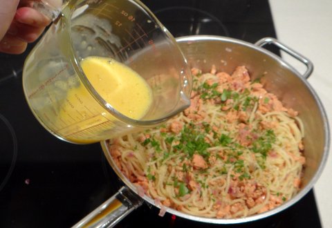Add the salmon to the onions about 1 minute before the pasta is ready.