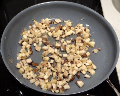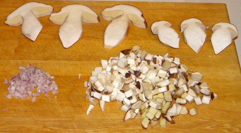 Cut the mushrooms into 8 mm (1/3 inch) slices. Keep 4-6 of the nicest looking slices and dice the rest (brunoise).
