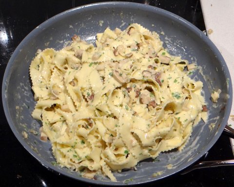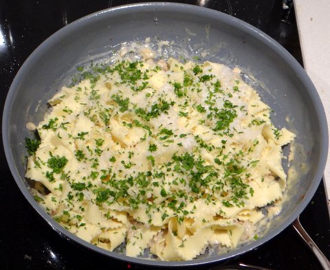Drain the pasta, reserving some of the cooking water, and add to the mushrooms together with freshly grated parmigiano and parsley.