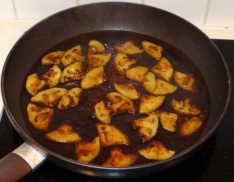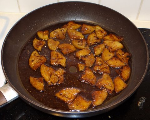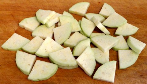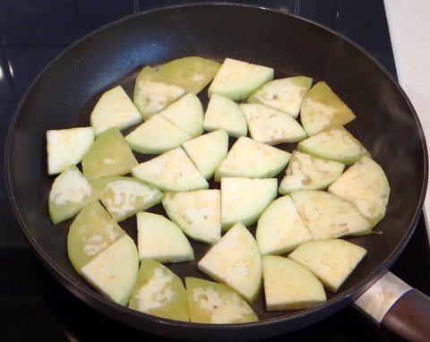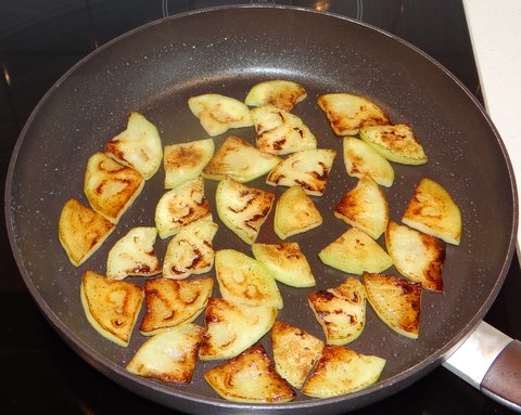 Peel the eggplant. Cut the eggplant in 1/2 cm (1/4 inch) slices, and cut the slices into quarters. I used 8 slices of similar size from the middle (widest) part, and reserved the remaining eggplant for another use.