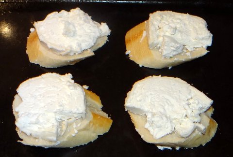 Arrange goat cheese on sliced bread and toast for a few minutes at about 10-15 cm (4-6″) from the heating elements.