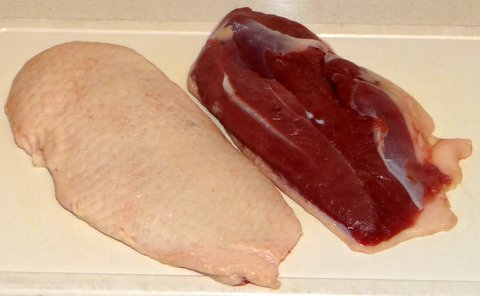 I finished cooking the duck breasts sous-vide, sealed together in a single pouch. I cooked them for 3 hours at 55C/131F for medium rare.