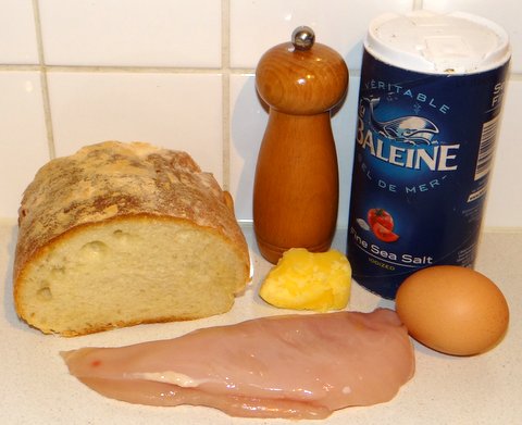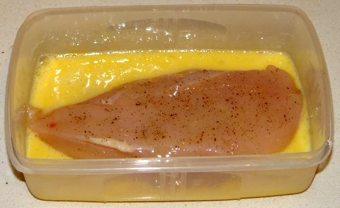 Beat the egg and put in a wide shallow container, just big enough to hold the chicken breast. Season the chicken breast with salt and freshly ground black pepper and coat with the beaten egg on both sides.
