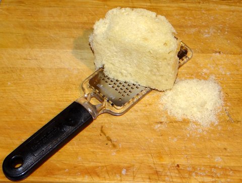 Remove the crust from the bread. Use a microplane grater (or the grating wheel of your food processor) to turn the bread into fresh breadcrumbs.