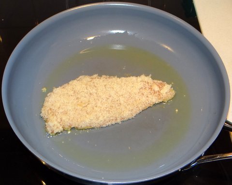 Spread out the breadcrumbs on a plate. Put the chicken breast on the breadcrumbs.