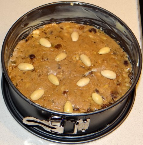 Chop the almonds, reserving 1/3 of the almonds whole for decoration. Also reserve 1/3 of the candied peel.