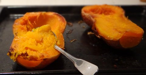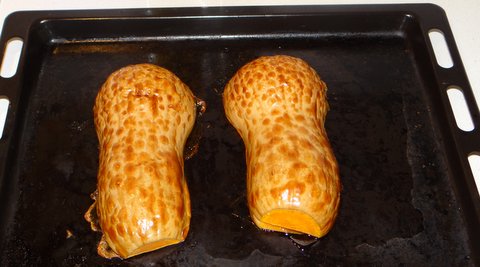 Put the squash halves on a baking sheet with some water (about 125 ml or 1/2 cup) and roast at 190C/375F for about 45 minutes or until tender (check with a fork).