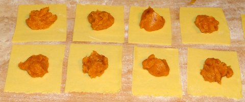 The special local ingredient that gives the tortelli a unique taste is mostarda (Mostarda di Cremona or Mostarda di Mantova): fruit candied in a mustard flavored syrup. You can make mostarda yourself, but all the recipes I’ve seen require mustard oil that is as hard to get in these parts as the mostarda itself. You can still make pumpkin tortelli without the mostarda, but the bland flavor of pumpkin or squash needs something extra so I would recommend to use either candied orange peel or grated orange zest as a substitute. Another important ingredient is crumbled amaretti cookies, which I have already used in many other pumpkin/squash recipes since it really helps to bring out the flavor.