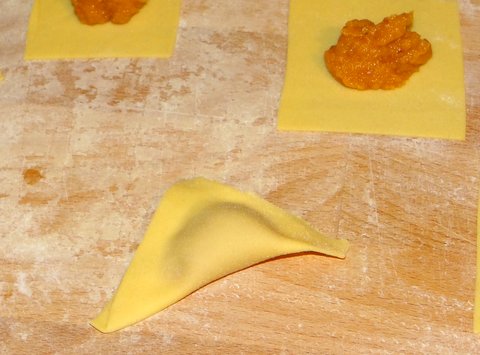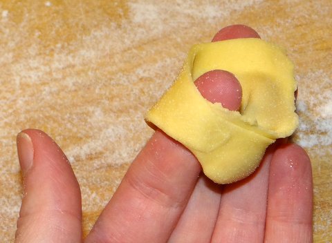 To shape tortelli, fold a square in half diagonally and pinch to seal the edges. Make sure there is no air trapped inside.
