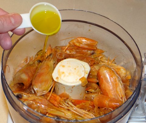 Another improvement I made is that I added the olive oil to the shrimp heads before whizzing them, which makes it easier to process them.