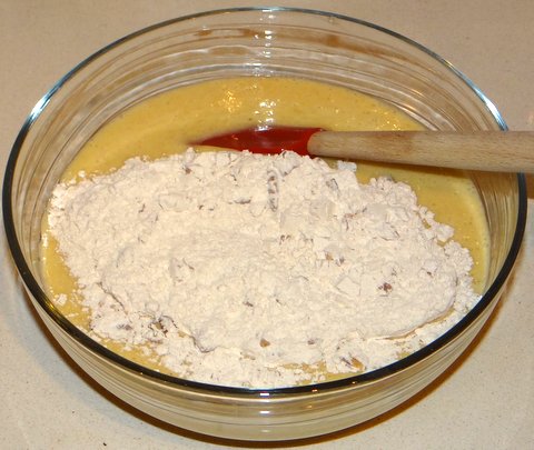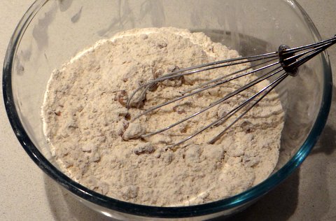 Combine the walnuts, 280 grams flour, 1 tsp baking powder, 1/4 tsp baking soda, 1/4 tsp salt, and 1 tsp ground cinnamon in a large bowl.