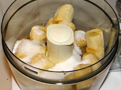 Combine 3 bananas,  150 grams sugar, 2 eggs, and 1 tsp vanilla extract in the bowl of the food processor.