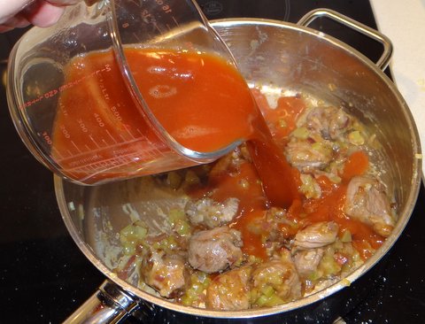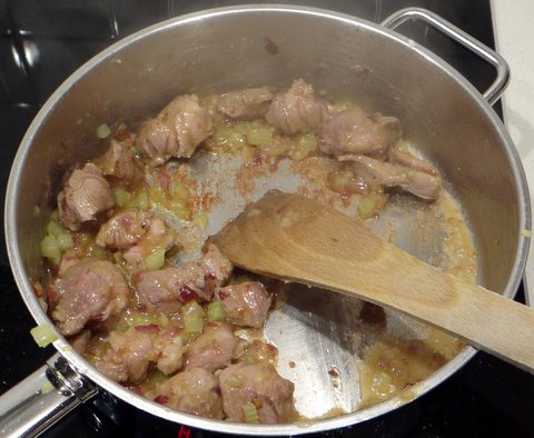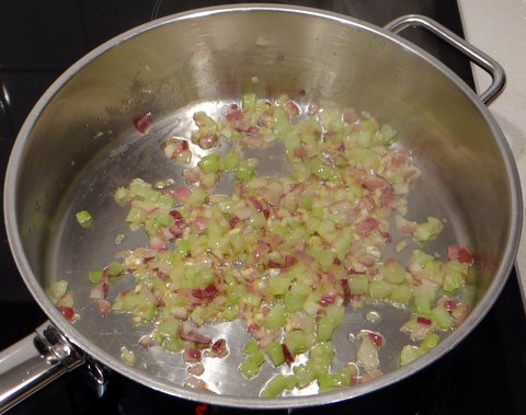 Heat 2 Tbsp olive oil in a casserole or frying pan. Add onion, garlic, celery and sauté until soft and fragrant.
