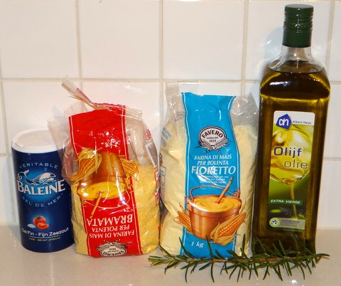 To make the polenta, first mix the fine cornmeal and the coarse corn meal.