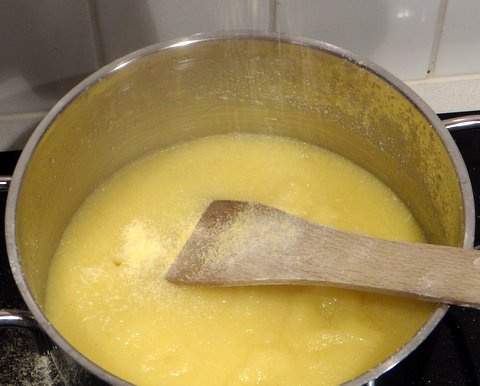 Keep stirring while you keep the ‘rain’ of cornmeal coming. To avoid lumps, it is important to keep stirring and to add the cornmeal very slowly.