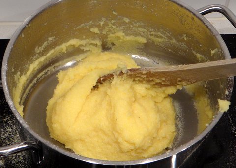 Bring the water toa boil and add the salt. Lower the heat and make a ‘rain’ of corn meal in the pan.