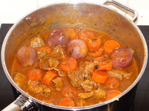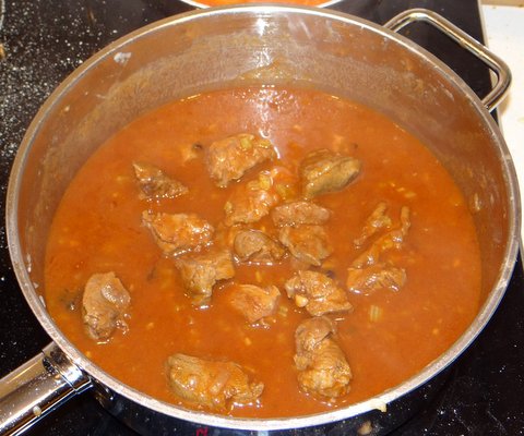 Cover, leaving the lid slightly askew. Lower the heat to a mere simmer, and simmer for 1 to 1 1/2 hours, stirring occasionally during the cooking.
