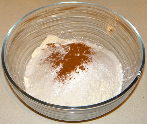 In a bowl combine 360 grams flour, 1/2 tsp cinnamon, 100 grams sugar, 2 tsp baking powder, and 1/2 tsp salt.