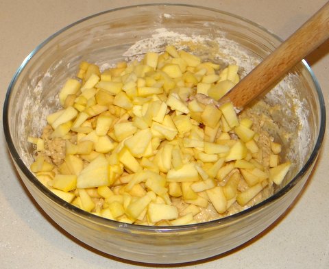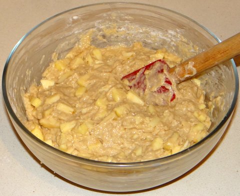 Peel and core the apples and cut into small pieces like I did, or grate like Putney Farm does. Add to the batter.