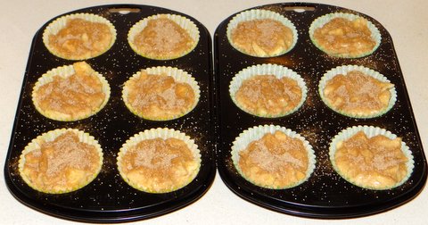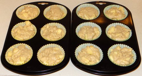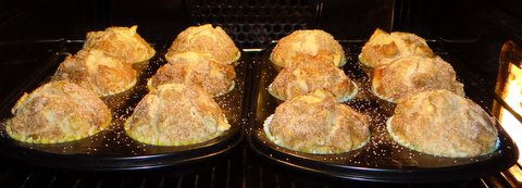 The final of five batches of a dozen muffins baked to celebrate my birthday at work: apple cinnamon muffins. I used a recipe from Putney Farm, thanks guys!  My original plan was to do only 4 batches, but I wondered if that would be enough and since I still had two apples lying around that were about to become wrinkly, I decided to make these as well. I’m glad that I did: I liked them a lot and so did my coworkers! The recipe is not very sweet, so this is also an excellent muffin to make for breakfast. Like Putney Farm suggests, you could also substitute 80 grams (1/2 cup) of the flour with wholewheat to make them even more suitable for breakfast.