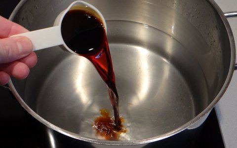 Fill a large stock pot with about 4 liters (4 quarts) of water. Put it on high heat to bring it to a boil. Add 60 ml soy sauce.