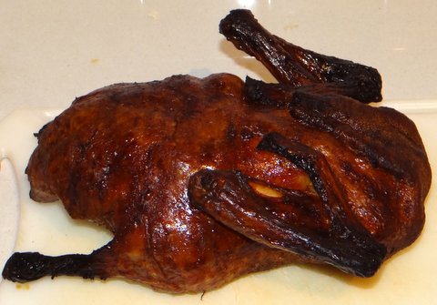 I love Peking Duck, but I always thought it was very difficult to make at home. I could hardly believe it when I saw the very simple recipe described by Stéphane on his blog My French Heaven. He just boils the whole duck with some honey and soy sauce, allows it to dry in the refrigerator and then roasts it for 1.5 hours at 250C/480F. I tried this and the result was quite good! Thanks Stéphane!