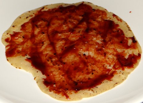 Everyone can make his or her own pancake. First spread some hoisin sauce on a pancake.