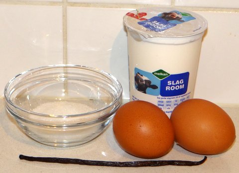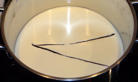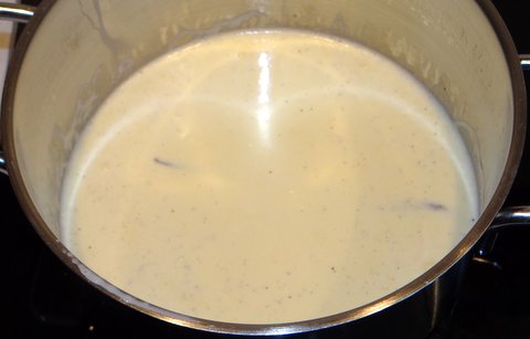 Put the cream in a saucepan with the vanilla bean and heat to about 85C/185F. The cream should not boil!