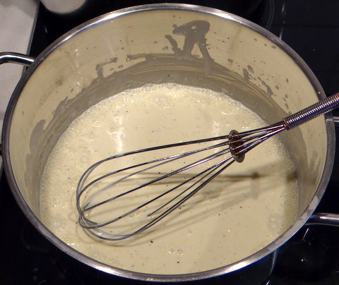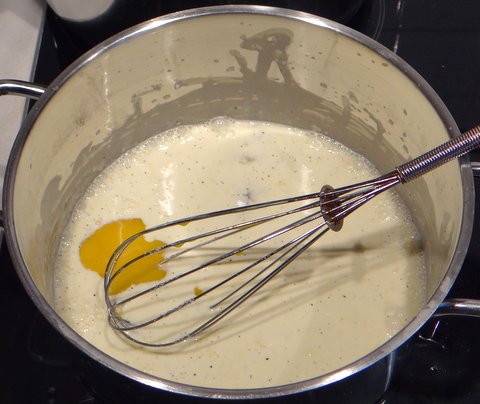 The dessert I made for Conor and the wife was PutneyFarm’s chocolate-packed brownies, and to make it even more special I made some crème anglaise to turn it into something that looked like a plated dessert. Crème Anglaise is the French name for vanilla sauce, which should of course be made from scratch using a good-quality vanilla bean. Good vanilla beans are fragrant and sticky. Stay away from the dried out sorry excuses for vanilla beans that are often sold at supermarkets, although those are still better than using synthetic vanilla. Synthetic vanilla contains only the most prominent compound called vanillin, and tastes boring compared to natural vanilla. If you can’t get good vanilla beans, pure vanilla extract (which is made from vanilla beans) is a good substitute.