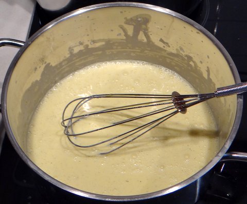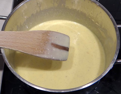 Heat, stirring, until the mixture has reached a temperature of 85C/185F (I like to use an instant-read thermometer) and the cream thickens and coats the back of a spoon.