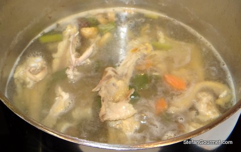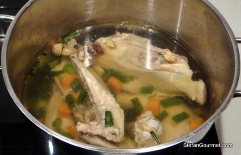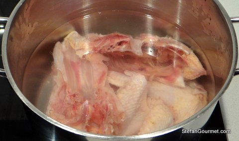 Cut the chicken into pieces, put in a stockpot and cover with cold water.